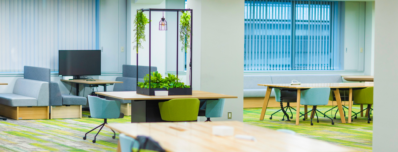 フリーアドレスを導入したオフィスも、チームの垣根を越えたコミュニケーションの活性化や柔軟な発想や想像力を掻き立てることに寄与し、既存に捉われず挑戦する心を刺激してくれます。